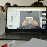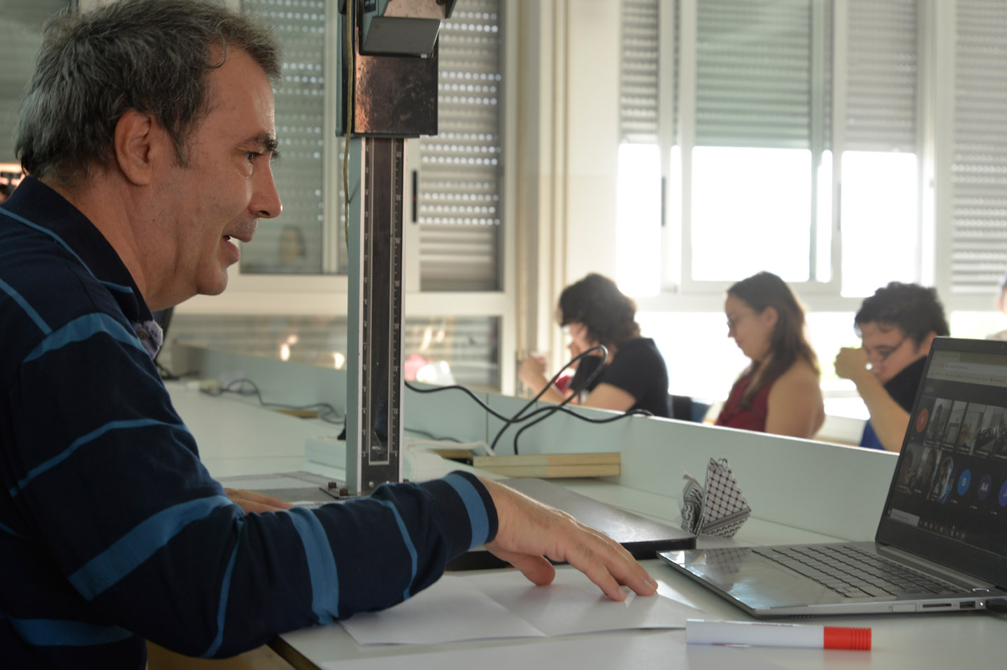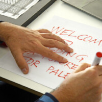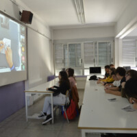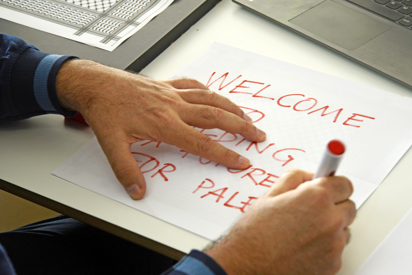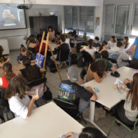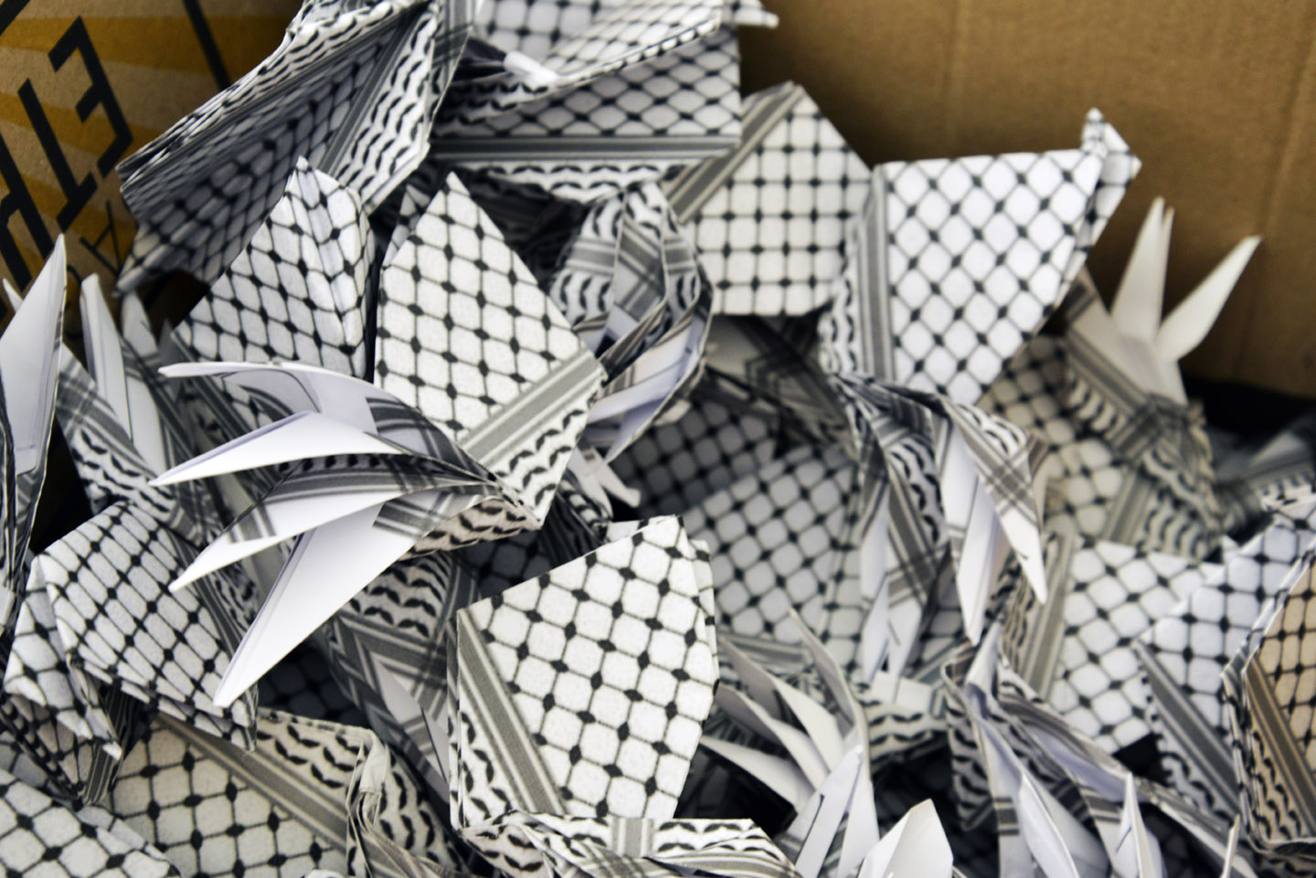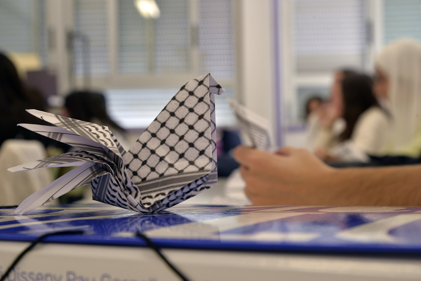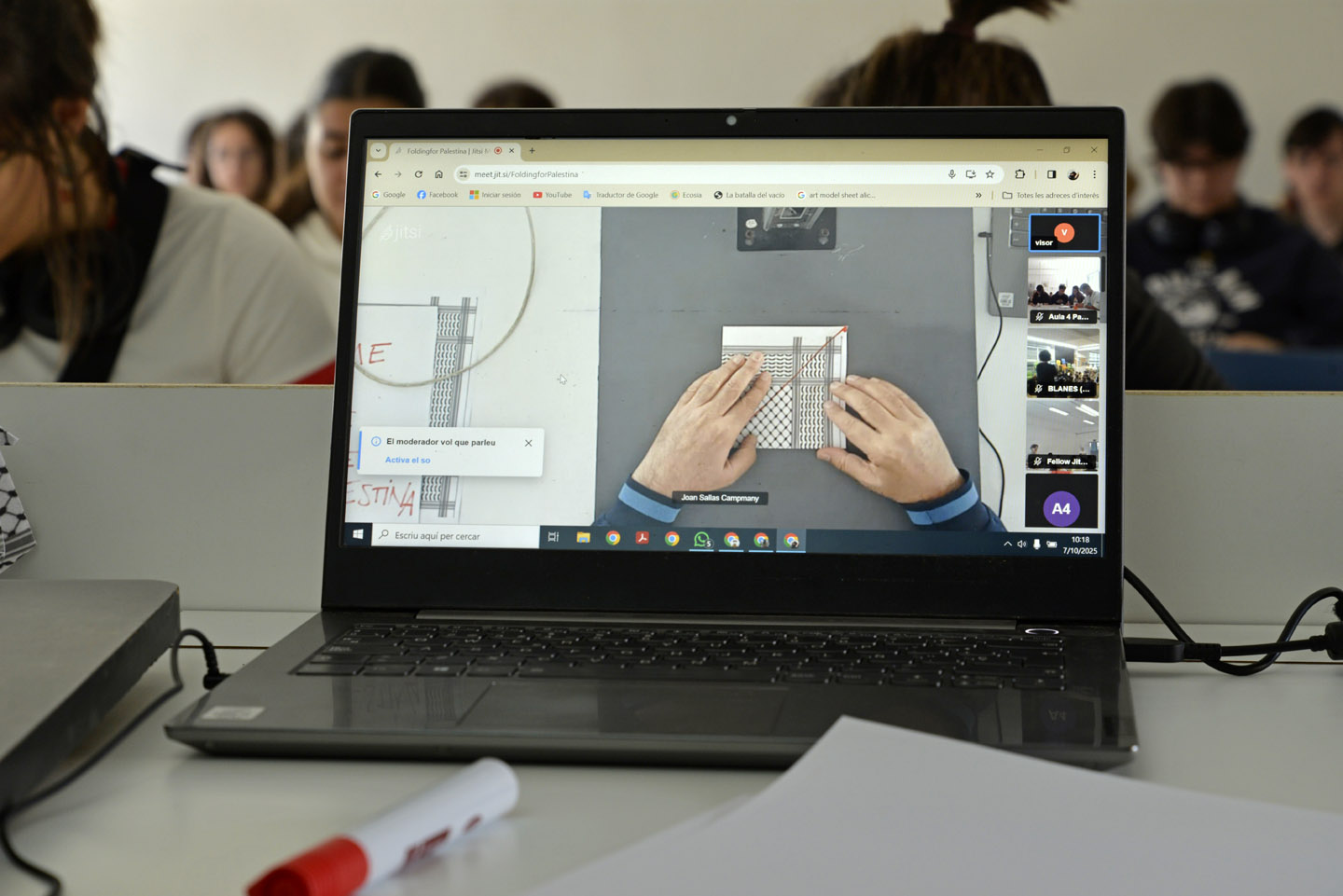 El taller de papiroflèxia impartit en format mixte - presencial i online - per Joan Sallas va consistir en crear coloms a partir del plegat de fotocòpies de la kufiya palestina. L'activitat va implicar a tot l'alumnat i professorat en horari de matí de l'escola així com a l’alumnat i professorat de cicles de tarda i d'altres escoles catalanes. També va comptar amb la connexió online d'alguns participants des de la franja de Gaza.